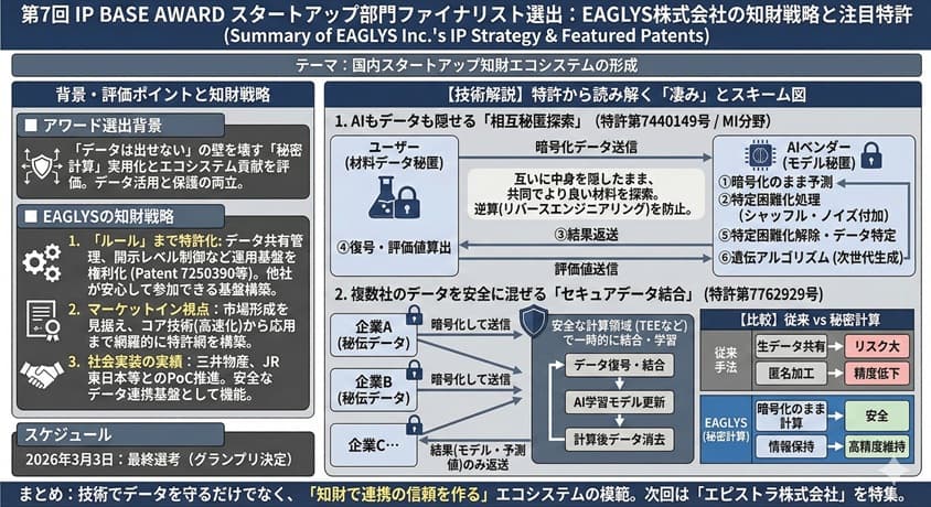 EAGLYSの取り組みは、「技術でデータを守る」だけでなく、「知財で連携の信頼を作る」という点で、まさに知財エコシステムの模範と言えるかもしれません。2026年3月3日の最終審査で、プレゼンテーションがどのように評価されるのか、今から非常に楽しみです。