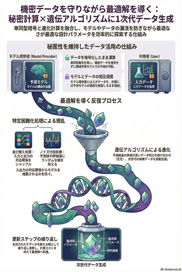 - 暗号化して予測:ユーザーは材料データを暗号化したまま送ります。AI側も中身を見ずに予測値を計算します。