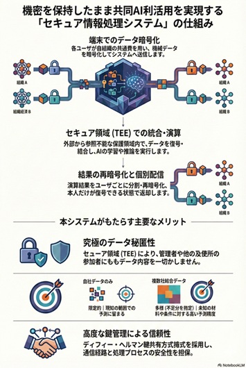 - 安全な場所で結合:各社はデータを暗号化して送信します。システムは、ハードウェアレベルで隔離された安全な領域(TEEなど)の中だけで、一時的にデータを復号・結合します。