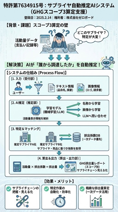 - 【技術①】AI(LLM)が活動量データから「サプライヤ」を自動推定し、Scope 3算定の工数を劇的に削減。
