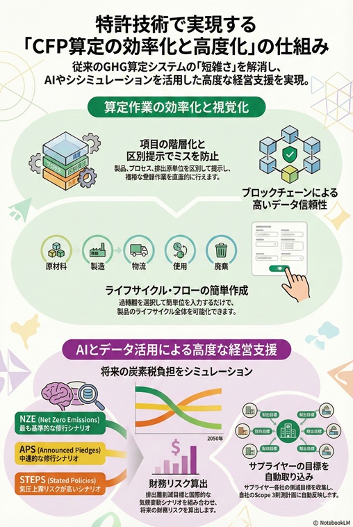 - 【技術②】CFP算定の誤入力を防ぐ「階層表示UI」や、ESG質問票の「回答自動化」など実務直結の機能を知財化。