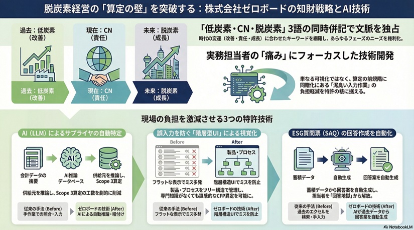 「低炭素」「カーボンニュートラル」「脱炭素」という3つの文脈を全て特許で押さえ、さらにAI(大規模言語モデル)を使って面倒な入力を自動化してしまう……。そんなゼロボードが持つ特許やその戦略について、考察を交えながら解説します。