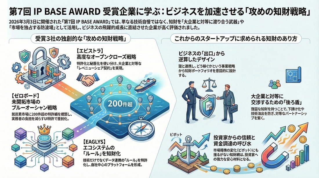 今回の記事で解説した受賞企業3社の「攻めの知財戦略」と、これからのスタートアップに求められる知財のあり方について、1枚の図解にまとめました。振り返りや社内での情報共有などにぜひご活用ください。